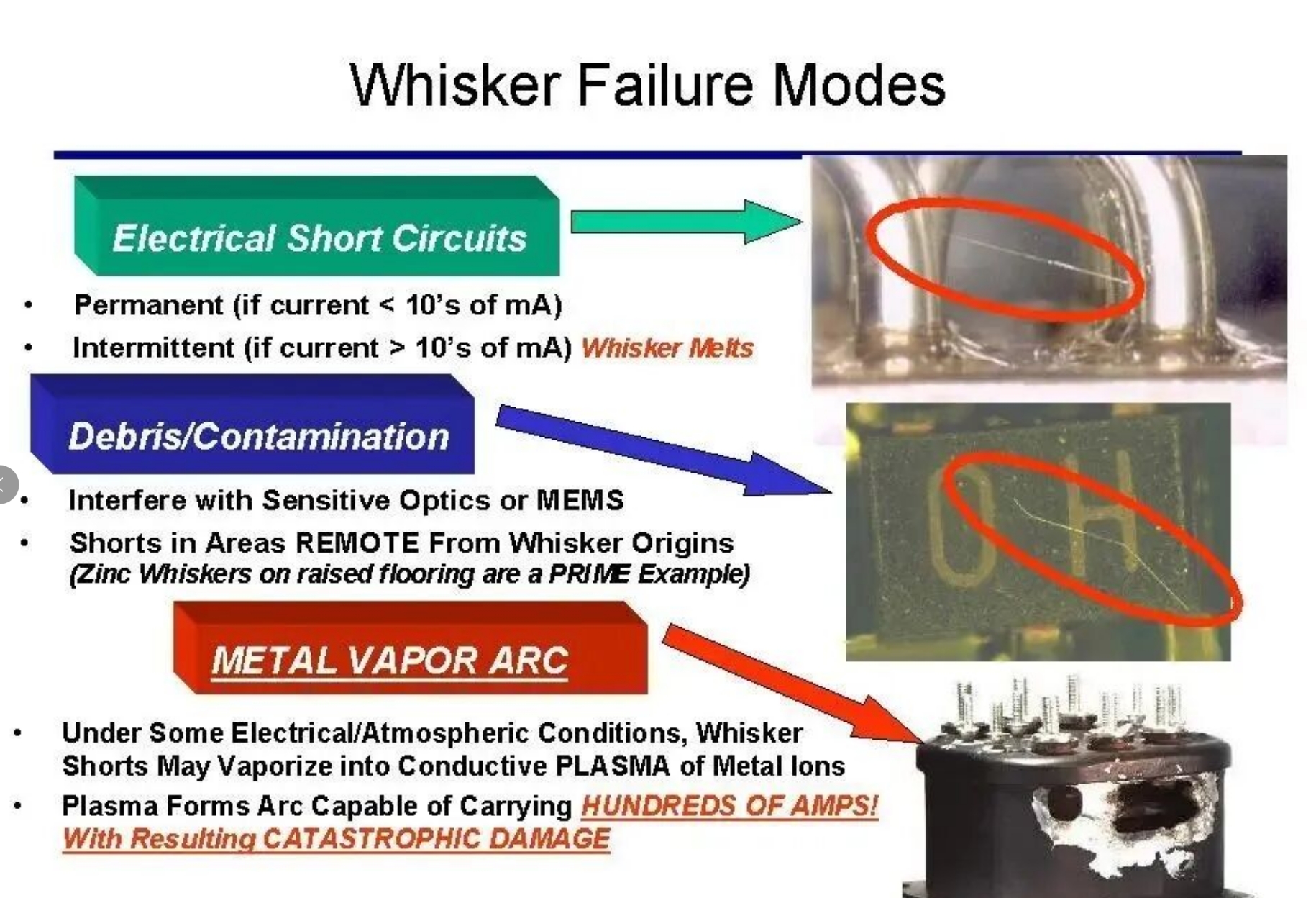 NASA 给的不是单一故障图,而是一整套 failure modes。低压近间距会桥连,高电流高电压条件下还可能拉出更重的后果。